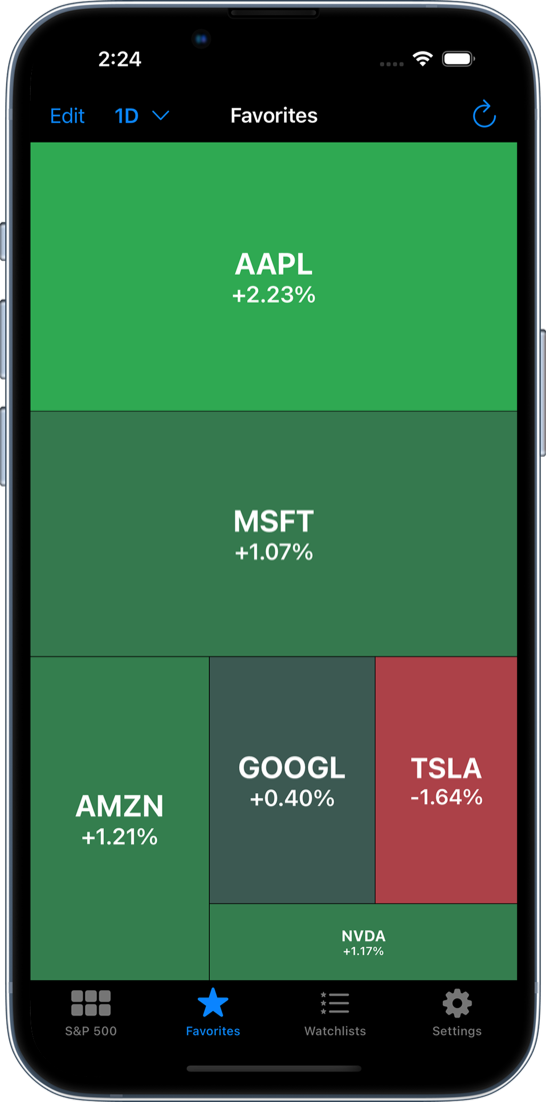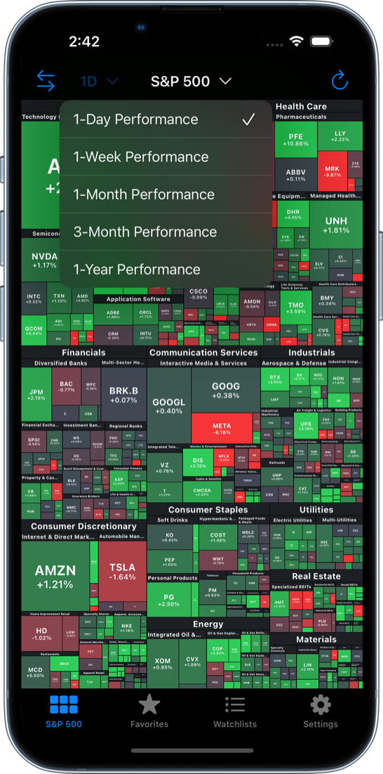 Track stock performance over timeframes like 1-Day, 1-Week, 1-Month, 3-Month, and 1-Year.